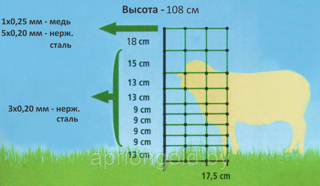 Сетка для овец сделана из высококачественных проводов. Верхний ряд провода повышенной токопроводимости, состоит из двух типов жил вплетённых в синтетическую основу: -5 жил нержавеющей стали и 1 одна жила из меди. На каждом столбике верхний изолятор и пробка препятствуют выходу сетки (фото 1).